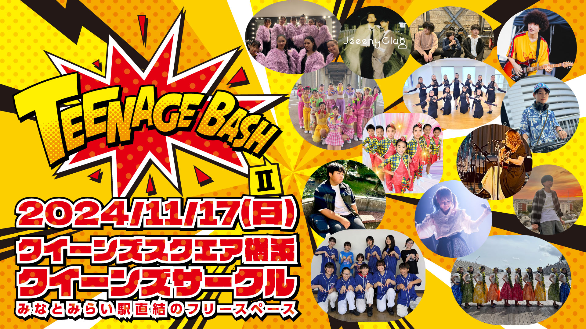 TEENAGE BASHは、「音楽でたくさんのハッピーとワクワクする明日を創りたい」をスローガンに様々な音楽イベントを企画している認定NPO法人アークシップがお届けする【10代限定のライブイベント】 1回目の昨年はライブホールに開催しましたが、2回目となる今年はより多くのお客さまに見てもらうために人通りの多いみなとみらいの「クイーンズサークル」にて観覧無料で開催します。 ご来場お待ちしています!!